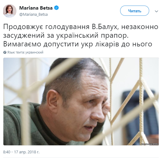 "Продолжает голодовку Владимир Балух, незаконно осужденный за украинский флаг. Требуем допустить украинских врачей к нему", - написала Беца.