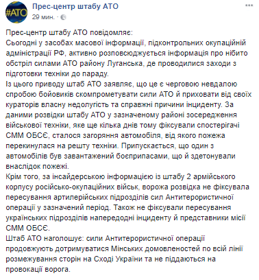 В штабе АТО 17 апреля прокомментировали информацию про срыв парада. В штабе АТО заявили такую версию попыткой сепаратистов скомпрометировать ВСУ и списать на действия украинской армии собственные потери.