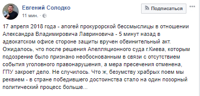 "Ожидалось, что после решения Апелляционного суда Киева, которым подозрение было признано необоснованным в связи с отсутствием события уголовного правонарушения, а мера пресечения отменена, ГПУ закроет дело. Не случилось. Что ж, безумству храбрых поем мы реквием - в стране победившего достоинства стало на один позорный политический процесс больше", - отметил Солодко.