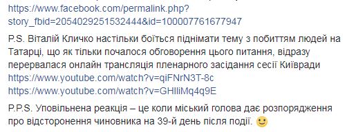 "В начале сессии Киеврады руководитель фракции "Свобода" Юрий Сиротюк обратился к Виталию Кличко с требованием освободить чиновников, виновных в событиях с избиением людей на Татарке 09.03.2018 года. Сиротюк также отметил, что депутаты-"свободовцы" требуют у генпрокурора Юрия Луценко переквалифицировать дело с "хулиганки" на статью 112 Уголовного кодекса "Посягательство на государственного деятеля" и передать это расследование Службе безопасности Украины, ведь очевидно, что Шевченковская полиция, которая все это покрывала, не проведет нормальное расследование", - написал он.
