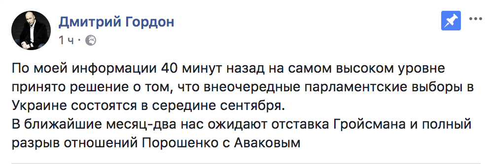 В то же время сегодня днем известный журналист Дмитрий Гордон опубликовал следующее сообщение на ФБ: "По моей информации, 40 минут назад на самом высоком уровне принято решение о том, что внеочередные парламентские выборы в Украине состоятся в середине сентября. В ближайшие месяц-два нас ожидают отставка Гройсмана и полный разрыв отношений Порошенко с Аваковым".