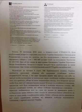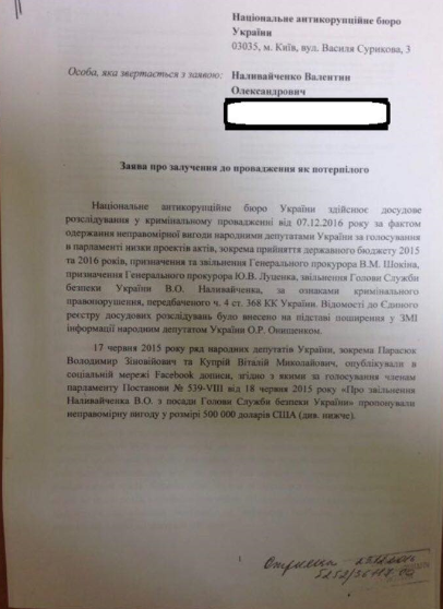 Национальное антикоррупционное бюро Украины осуществляет уже почти полтора года досудебное расследование в уголовном производстве №52016000000000466 от 07.12.2016 года по факту получения неправомерной выгоды народными депутатами Украины за голосование в парламенте ряда законопроектов, в частности принятие государственного бюджета 2015 и 2016, назначения и увольнения Генерального прокурора Шокина, назначение Генерального прокурора Луценко, освобождение Председателя Службы безопасности Украины Наливайченко, по признакам уголовного преступления, предусмотренного ст.368 Уголовного кодекса Украины.