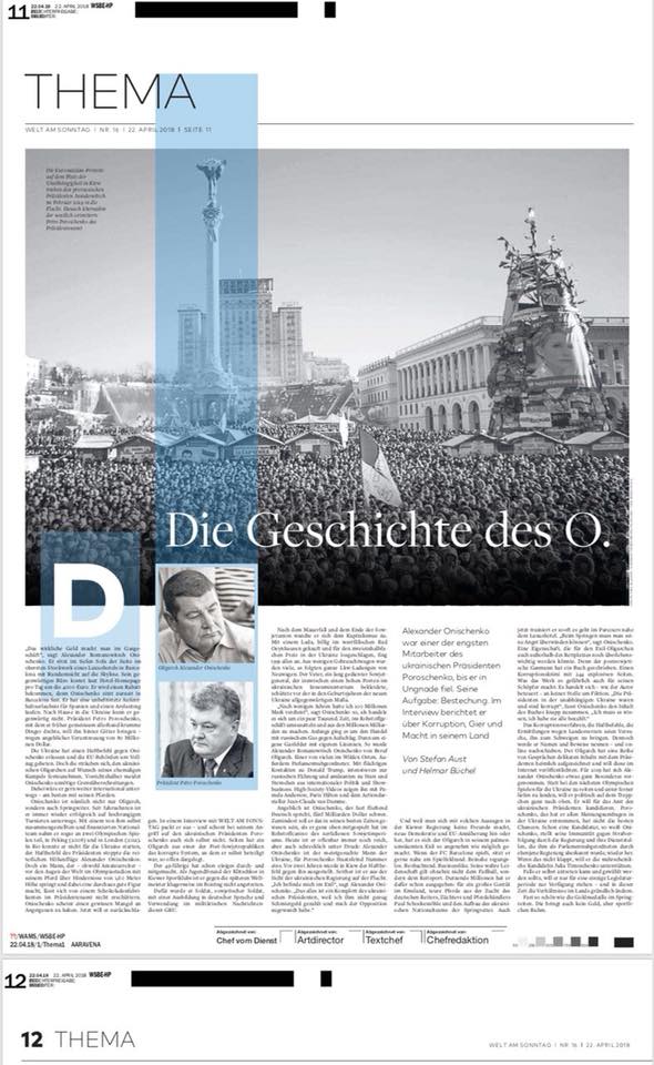 Крупнейшая немецкая газета Die Welt посвятила теме коррупции Петра Порошенко несколько полос газеты на основе откровений Онищенко.