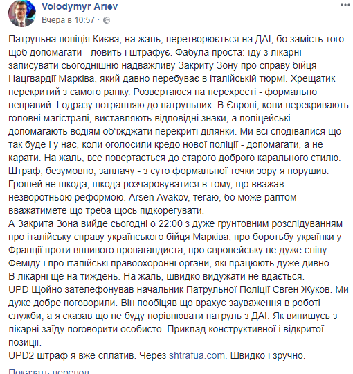 "Крещатик перекрыт с самого утра. Разворачиваюсь на перекрестке - формально прав. И сразу попадаю в патрульных. В Европе, когда перекрывают главные магистрали, выставляют соответствующие знаки, а полицейские помогают водителям объезжать перекрытые участки. Мы все надеялись что так будет и у нас, когда объявили кредо новой полиции - помогать, а не наказывать. К сожалению, все возвращается к старому доброму карательного стиля. Штраф, безусловно, заплачу - с чисто формальной точки зрения я нарушил. Денег не жалко, жалко разочаровываться в том, что считал необратимой реформой", - написал он.