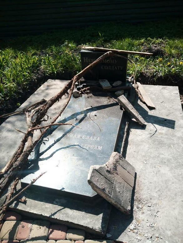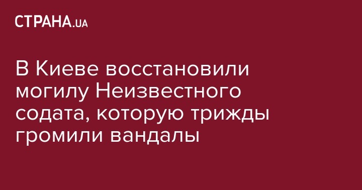 Могила Неизвестного солдата в Киеве возле метро "Житомирская" трижды разрушалась вандалами. Здесь похоронен разведчик, который первым 5 ноября 1943 года вошел в Киев со стороны Лютежского плацдарма. Он был убит, героя похоронили местные жители среди семи сосен (в те времена там был частный сектор - Прим.Ред.).