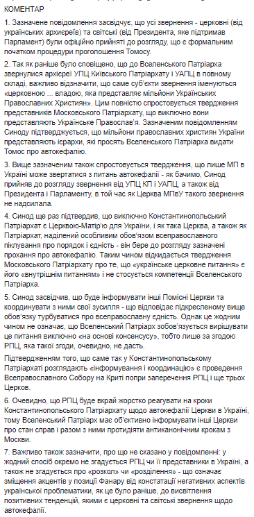 Чего действительно нет в тексте константинопольского Синода - так это "начала процедуры предоставления автокефалии", о которих писали Петр Порошенко и УПЦ КП.