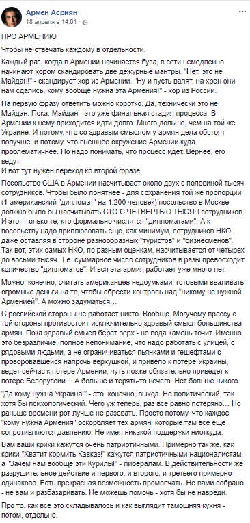 А к посольству надо приплюсовать еще как минимум сотрудников некоммерческих организаций (НКО), даже оставляя в стороне разнообразных "туристов" и "бизнесменов". Так вот этих самых НКО, по разным оценкам, насчитывается от четырех до восьми тысяч. Т.е. суммарное число сотрудников в разы превосходит количество "дипломатов". И вся эта армия работает уже много лет", – пишет живущий в Москве Армен Асриян.