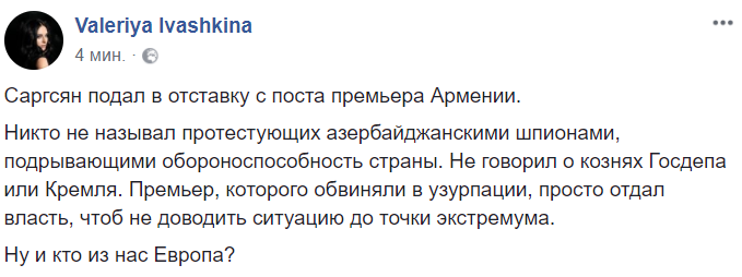 Ну и кто из нас Европа?" – пишет Ивашкина, сравнивая поступок Саргсяна с тем, как относятся украинские власти к любым оппозиционным движениям.