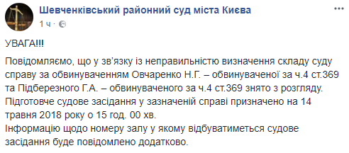 Дело по обвинению судей Натальи Овчаренко и Геннадия Подберезного снято с рассмотрения в связи с неправильностью определения состава суда.