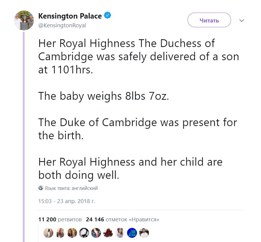 Об этом в Twitter сообщила пресс-служба Кенсингтонского дворца.