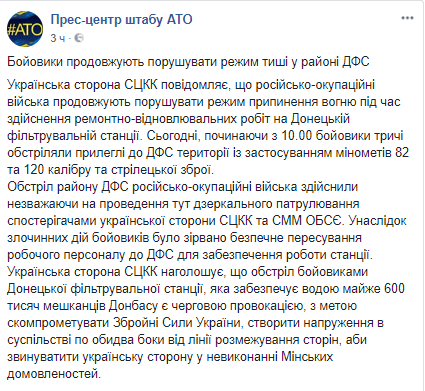 Кроме того, из-за обстрелов, как отмечают в штабе, было сорвано безопасное передвижение персонала Донецкой фильтровальной станции.