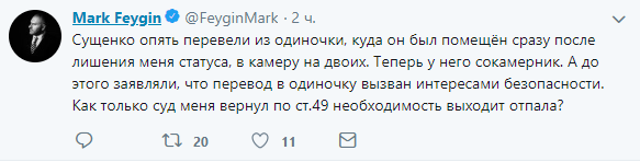 "Сущенко снова перевели из одиночки, куда он был помещен сразу после лишения меня адвокатского статуса, в камеру на двоих. Теперь у него сосед по камере. А до этого заявляли, что перевод в одиночку обусловлено интересами безопасности. Как только суд меня вернул по ст . 49 УПК, необходимость выходит отпала? Еще будет немало чудес ... ", - написал Фейгин.