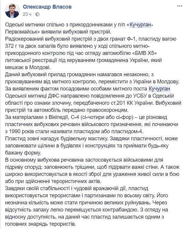 "Радиоуправляемое взрывное устройство из двух гранат Ф-1, 372 граммов пластида С-4 и двух запалов выявили в пункте пропуска "Кучурган-Первомайск". Оно находилось в автомобиле BMW Х5 с литовскими номерами. Управлял им гражданин Украины, проживающий в Молдове. Он хотел перевезти взрывное устройство из Украины в Молдову", - говорится в сообщении.