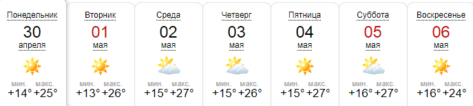 Сайт Weather.com сообщает, что неделя будет солнечной до +25...+28. В воскресенье днем +24.