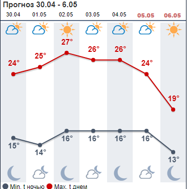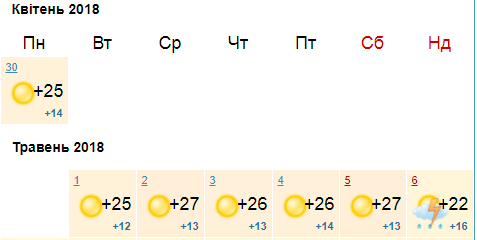 Всю неделе в Киеве обещают солнечную погоду до +25...+28 днем. Особенно жарко будет в среду, 2 мая. А в воскресенье, 6 мая, температура немного снизится до +19. Некоторые ресурсы не исключают в этот день дождь, но большинство считает, что выходные все-таки пройдут без осадков.