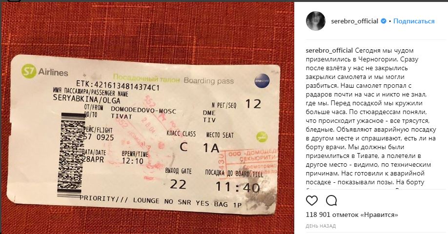 На борту самолета находилась российская группа Serebrо. Солистка группы Serebro Ольга Серябкина написала о произошедшем в Instagram.