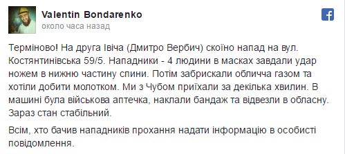"На Дмитрия Вербича совершили нападение на улице Константиновская, 59/5. Нападавшие - 4 человека в масках", - написал он.