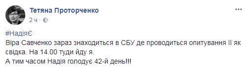 "Вера Савченко сейчас находится в СБУ, где проводится опрос ее как свидетеля. На 14.00 туда иду я", — написала она. Она добавила, что Надежда Савченко голодает уже 42 день.