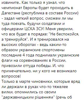 "Меня уверили, что все будет в порядке: "Не беспокойся, а тренируйся". И я тренировался на высоких оборотах – ведь каким-то образом украинские спортсмены последние четыре года поднимали украинские флаги на соревнованиях в России, привозили оттуда победы. И что примечательно, ни у кого не возникало вопросов!" – написал спортсмен.