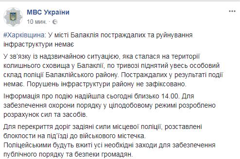 "В связи с чрезвычайной ситуацией, произошедшей на территории бывшего хранилища в Балаклее, по тревоге поднят весь личный состав полиции Балаклейского района. Пострадавших в результате происшествия нет. Нарушений инфраструктуры района не зафиксировано", - отмечается в сообщении.