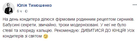 Кроме рецепта сырников и поздравлений с Днем кондитера, который действительно отмечается 3 мая, Тимошенко "обратилась  к одному очень известному политику" с призывом "вернуться в профессию", намекая на Петра Порошенко.