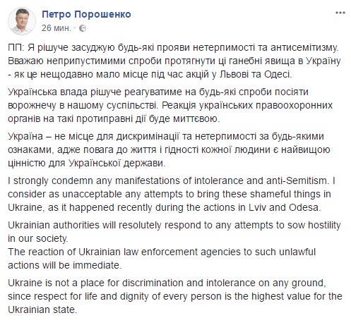 Порошенко написал: "Я решительно осуждаю любые проявления нетерпимости и антисемитизма. Считаю недопустимыми попытки протянуть эти позорные явления в Украине - как это недавно имело место во время акций во Львове и Одессе. Украинская власть будет решительно реагировать на любые попытки посеять вражду в нашем обществе. Реакция украинских правоохранительных органов на такие противоправные действия будет мгновенной. Украина - не место для дискриминации и нетерпимости по любым признакам, ведь уважение к жизни и достоинству каждого человека являются высшей ценностью для Украинского государства", - написал он.