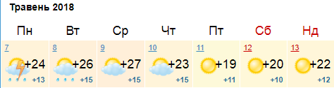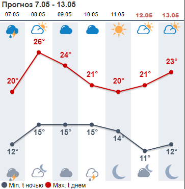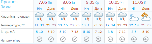 Ресурс Мeteoprog.ua обещает дождь только в понедельник, 7 мая. Вторник, 8 мая, будет теплым, до +26. В остальные дни недели +20...+23.