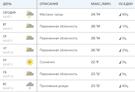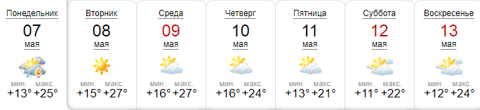 Сайт Gismeteо прогнозирует осадки 7-8 мая. Самым теплым днем недели станет среда, 9 мая, когда потеплеет до +27. Затем немного похолодает до +19...+23 днем. Без осадков.