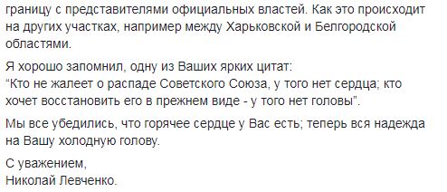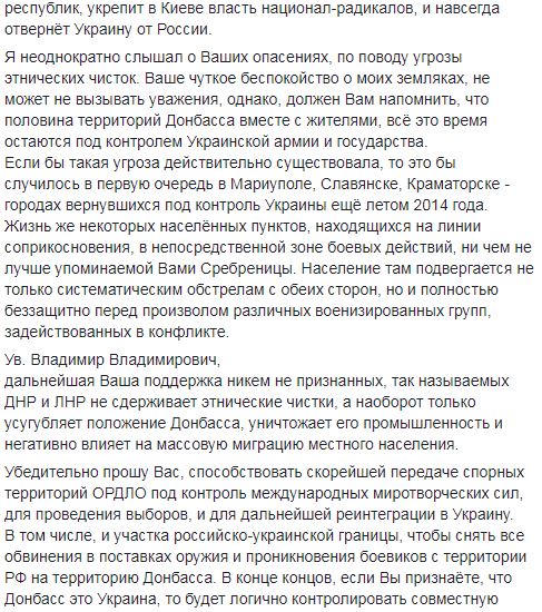 "Ув. Владимир Владимирович, дальнейшая Ваша поддержка никем не признанных, так называемых ДНР и ЛНР не сдерживает этнические чистки, а наоборот только усугубляет положение Донбасса, уничтожает его промышленность и негативно влияет на массовую миграцию местного населения", - написал бывший нардеп.