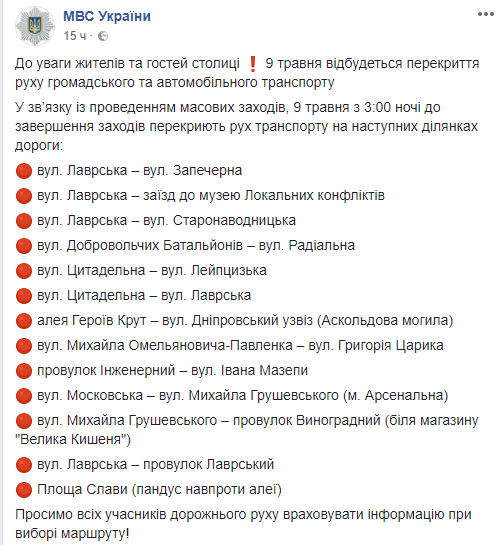 Также перекрыто движение транспорта на участках ул. Лаврская - ул. Запечерная, ул. Лаврская - въезд в музей Локальных конфликтов, ул. Лаврская - ул. Старонаводницкая, ул. Добровольческих Батальонов - ул. Радиальная, ул. Цитадельная - ул. Лейпцигская, ул. Цитадельная - ул. Лаврская, ул. Омельяновича-Павленко - ул. Григория Царика, пров. Инженерный - ул. Ивана Мазепы, ул. Московская - ул. Михаила Грушевского дл метро "Арсенальная", ул. Михаила Грушевского - пров. Виноградный, ул. Лаврская - пров. Лаврский.