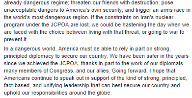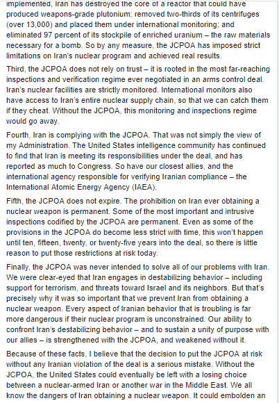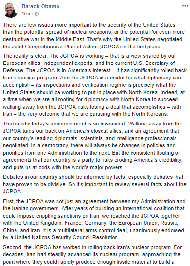 "Уходя от СВПД, мы поворачиваемся спиной к ближайшим союзникам Америки и к соглашению, над которым работали ведущие дипломаты, ученые и разведчики нашей страны. В условиях демократии всегда будут происходить изменения в политике и приоритетах от одной администрации к другой, но последовательное пренебрежение соглашениями... рискует подорвать доверие к Америке и ставит нас в контрпозицию с крупнейшими мировыми державами", - написал Обама.