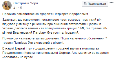 "Просим помолиться за здоровье Патриарха Варфоломея. Кажется, что напряжение последнего времени, в частности давление, которое он испытывает в связи с решением о признании автокефалии церкви в Украине, сказывается. 78-летний Вселенский Патриарх был госпитализирован. Причиной называют головокружение. После надлежащего обследования 7 мая патриарх был выписан из больницы", - написал архиепископ в Facebook 9 мая.
