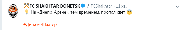20.30 "И это врядли из-за коммуналки". В 2013 году на "Днепр-Арене" уже пропадал свет во время матча Днепр – Металлист. Футболисты доигрывали на следующий день. Может быть нас ждет первый в истории Украины двухдневный матч за кубок? Скоро узнаем!