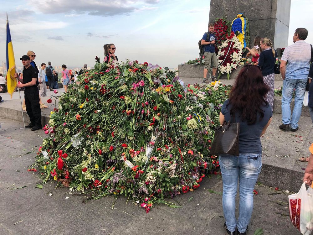 Сегодня, 9 мая, когда Украина отмечает День Победы, у Вечного огня в Киеве собралось огромное количество цветов, которые люди принесли в память о героях.
