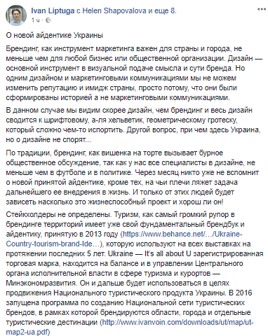 "Стейкхолдеры не определены. Туризм, как самый громкий рупор в брендинге территорий, имеет уже свой фундаментальный брендбук и айдентику, принятую в 2013 году, которую используют на всех выставках на протяжении последних 5 лет. "Ukraine-It’s all about U" – зарегистрированная торговая марка, находится на балансе и в управлении … Минэкономразвития и будет дальше использоваться в целях продвижения Национального туристического продукта Украины", - написал Липтуга