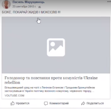 Среди прочих записей Марущинца можно увидеть такие антисемитские посты: "Ж@ды огласили войну Германии в 1934 году", "Боже, накажи ж@дов", "Бабий Яр. Не ж@дов в 1941 году, а украинцев 1918-1941 тут убито", "Ж@ды – говно".
