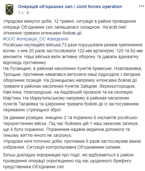 "Российско-оккупационные войска 73 раза нарушали режим прекращения огня, из них 20 раз применяли 122-мм артиллерию, 120 и 82-мм минометы. (…) В течение ночи текущих суток, противник 6 раз применял тяжелое вооружение. Ситуация контролируется Объединенными силами", – сказано в сообщении.