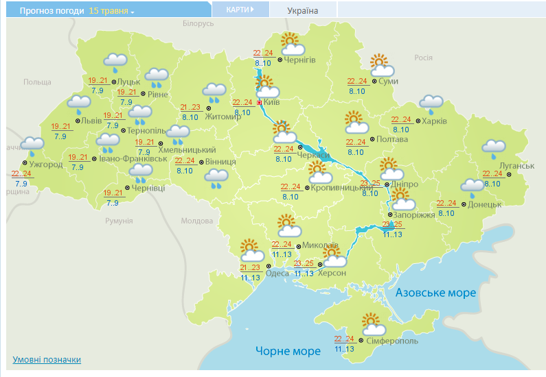Температура ночью 6-11° (в Карпатах 2-5° тепла, на почве местами заморозки 0-2°), температура днем 15-20°, в южной части и в Закарпатье до 23°.