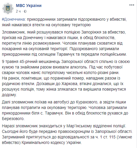 "9 мая 45-летний житель Запорожской области вместе со своей кумой и знакомым вместе употребляли алкоголь. Во время бытовой ссоры мужчина нанес потерпевшему многочисленные колото-резаные раны. На утро, заметив, что раненый умер, нападающий вместе с родственницей убежали. Доехав в Харьков, беглецы узнали, что их разыскивает полиция, поэтому женщина испугалась и решила вернуться домой. Далее злоумышленник поехал на автобусе в Курахово, а оттуда пешком планировал попасть на неподконтрольную территорию", - говорится в сообщении МВД Украины в соцсети Facebook.