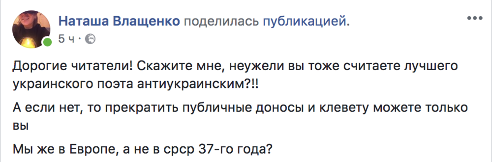 "Дорогие читатели! Скажите мне, неужели вы тоже считаете лучшего украинского поэта антиукраинским? А если нет, то прекратить публичные доносы и клевету можете только вы Мы же в Европе, а не в срср 37-го года? Премия Волошина присуждается ежегодно ко дню рождения поэта - 16 мая (но не позднее 1 июня). Жюри определяет по одному лауреату в поэзии и прозе. Размер премии составляет 5000 гривен в каждой из этих двух номинаций (за лучшую поэтическую книгу и лучшую прозаическую книгу)", - написала Влащенко.