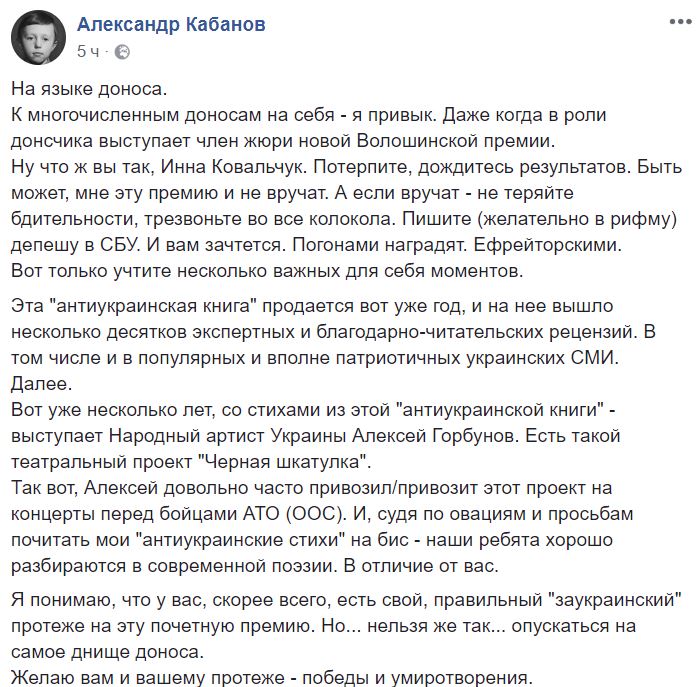 "Не имею привычки выходить в социальные сети с подобными вещами, но здесь, считаю, смысл есть. Я вхожу в жюри русскоязычной премии НСПУ им.Максимилиана Волошина. Один из претендентов - киевский поэт Александр Кабанов. Цитирую строку по представлению издательства "Фолио": "Книга" На языке врага "свидетельствует украинскость жизненной позиции автора, острая боль за то, что происходит в родной стране". Ниже приведу одно из стихотворений, который, по мнению "Фолио", свидетельствует украинскость автора. Вот и думаю, я же слепая и лишена чувств, или "Фолио" откровенно смеется надо мной", - пишет Ковальчук.