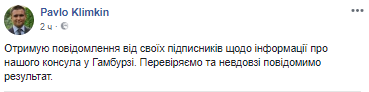 "Получаю сообщение от своих подписчиков по информации о нашем консуле в Гамбурге. Проверяем и вскоре сообщим результат", - написал Климкин.