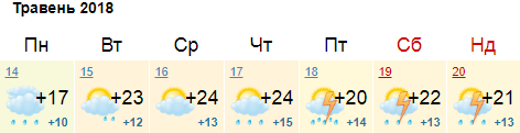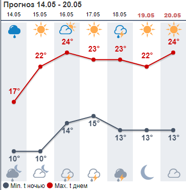 По данным сайта Sinoptik.ua обещает дождь в понедельник, пятницу и субботу. Самым холодным днем недели будет понедельник, 14 мая, до +16 днем. Далее в дневное время воздух прогреется до +21...+24.