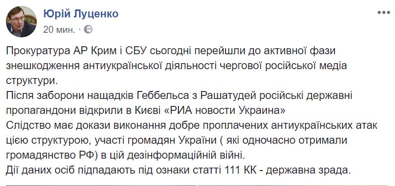 "После запрета потомков Геббельса из Рашатудей российские государственные пропагандоны открыли в Киеве "РИА Новости Украина". Следствие располагает доказательствами выполнения хорошо проплаченных антиукраинских атак этой структурой, участия граждан Украины (одновременно получили гражданство РФ) в этой Дезинформационная войне. Действия данных лиц подпадают под признаки статьи 111 УК - государственная измена", - написал Луценко.