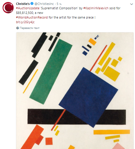 Картину Казимира Малевича "Супрематическая композиция" продали за более чем $85,8 млн на аукционе в Нью-Йорке. Это новый мировой аукционный рекорд для данного художника за работу, продаваемую повторно.