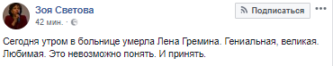 "Сегодня утром в больнице умерла Лена Гремина. Гениальная, великая. Любимая. Это невозможно понять. И принять", - говорится в сообщении Световой.