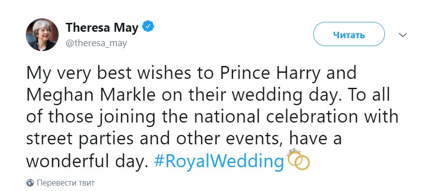 Премьер-министр Великобритании Тереза Мэй обратилась к принцу Гарри и американской актрисе Меган Маркл с наилучшими пожеланиями в день их свадьбы. Глава британского правительства оставила послание жениху и невесте в субботу на своей странице в Twitter.