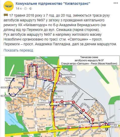 В четверг, 17 мая, из-за ремонта на бульваре Академика Вернадского в Киеве автобус №97 изменит маршрут.