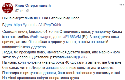 Сегодня ночью, 21 мая, около 01:30, на Столичном шоссе произошло смертельное ДТП.  Микроавтобус Volkswagen, который ехал в сторону Киева, по неизвестным пока причинам, слетел с трассы в кювет, и на большой скорости врезался в дерево.