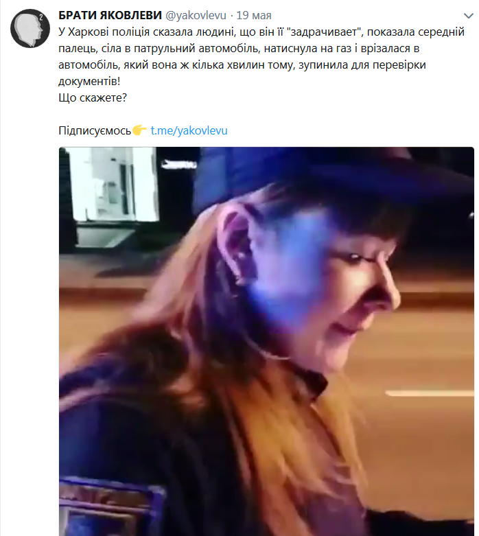 "В Харькове полиция сказала человеку, что он ее "задр@чивает", показала средний палец, села в патрульную машину, газанула и врезалась в машину, которую она же несколько минут назад остановила, чтобы проверить документы! Что вы скажете?" - говорится в сообщении.